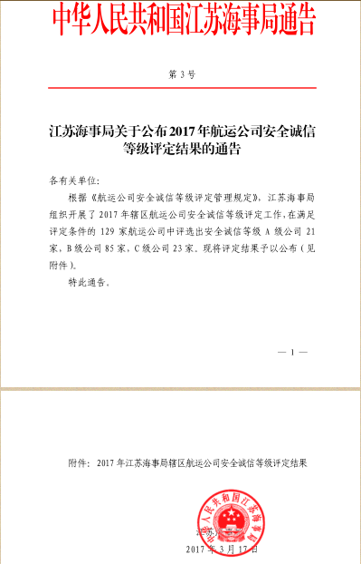 中港建設(shè)集團榮獲“江蘇海事局安全誠信等級A級公司” 榮譽稱號
