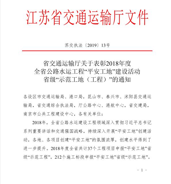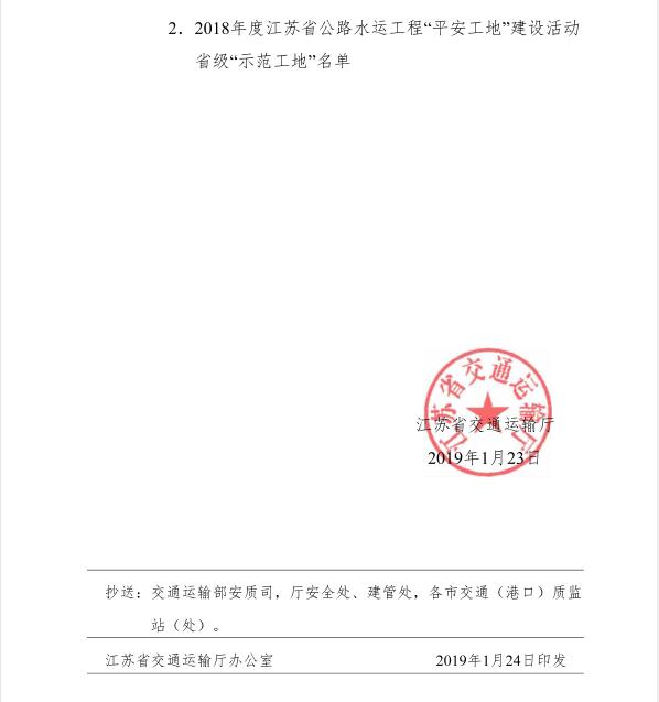 南通港呂四港區(qū)進(jìn)港航道工程 榮獲“2018年度江蘇省級(jí)平安示范工地”榮譽(yù)稱號(hào)