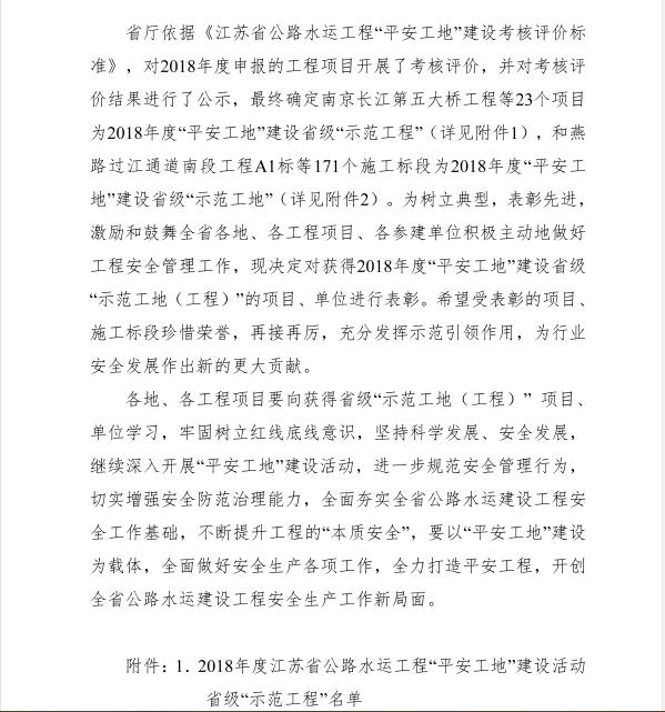 由中港建設(shè)集團(tuán)有限公司施工的“南通港呂四港區(qū)10萬(wàn)噸級(jí)進(jìn)港航道(二階段)工程”被江蘇省交通運(yùn)輸廳表彰為全省公路水運(yùn)工程省級(jí)平安示范工地,體現(xiàn)了我公司牢固樹立紅線底線意識(shí)的自覺(jué)性,堅(jiān)持科學(xué)發(fā)展、安全發(fā)展的前瞻性,深入開(kāi)展平安工地建設(shè)的持續(xù)性。