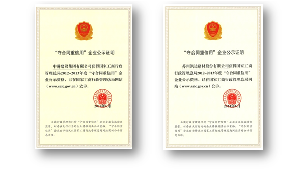 2014年6月,經(jīng)國家工商行政管理總局對(duì)全國所有在冊(cè)企業(yè)進(jìn)行考評(píng),中港建設(shè)集團(tuán)有限公司及下屬公司蘇州凱達(dá)路材股份有限公司雙雙被國家工商總局認(rèn)定為2012-2013年度“守合同重信用”企業(yè)稱號(hào)。近期,中港建設(shè)集團(tuán)有限公司及下屬公司蘇州凱達(dá)路材股份有限公司收到國家工商行政管理總局“守合同重信用”企業(yè)榮譽(yù)證書。
